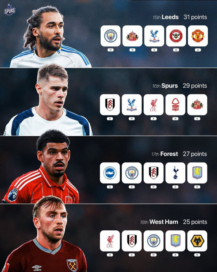 真正的生死博弈,发生在安全区边缘,诺丁汉森林、西汉姆联同积29分,仅领先降级区3-5分,利兹联、水晶宫、热刺也仅高出一筹,积分差距最多不过3分,剩余8-9轮联赛,每一轮直接对话都是“六分战”,一场失利就可能直接坠入降级深渊,哪怕是昔日豪门热刺,也面临着18%左右的降级风险,丝毫不敢松懈。
