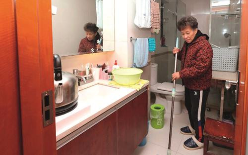2020年12月30日,邱燕萍在动迁到青浦区的新房子里打扫宽敞的卫生间。(图/新华社记者方喆)