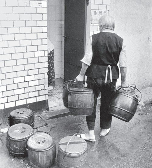 普陀区曾经的“两湾一宅”地块,居民在倒马桶。(上海人民城市实践展示馆供图)